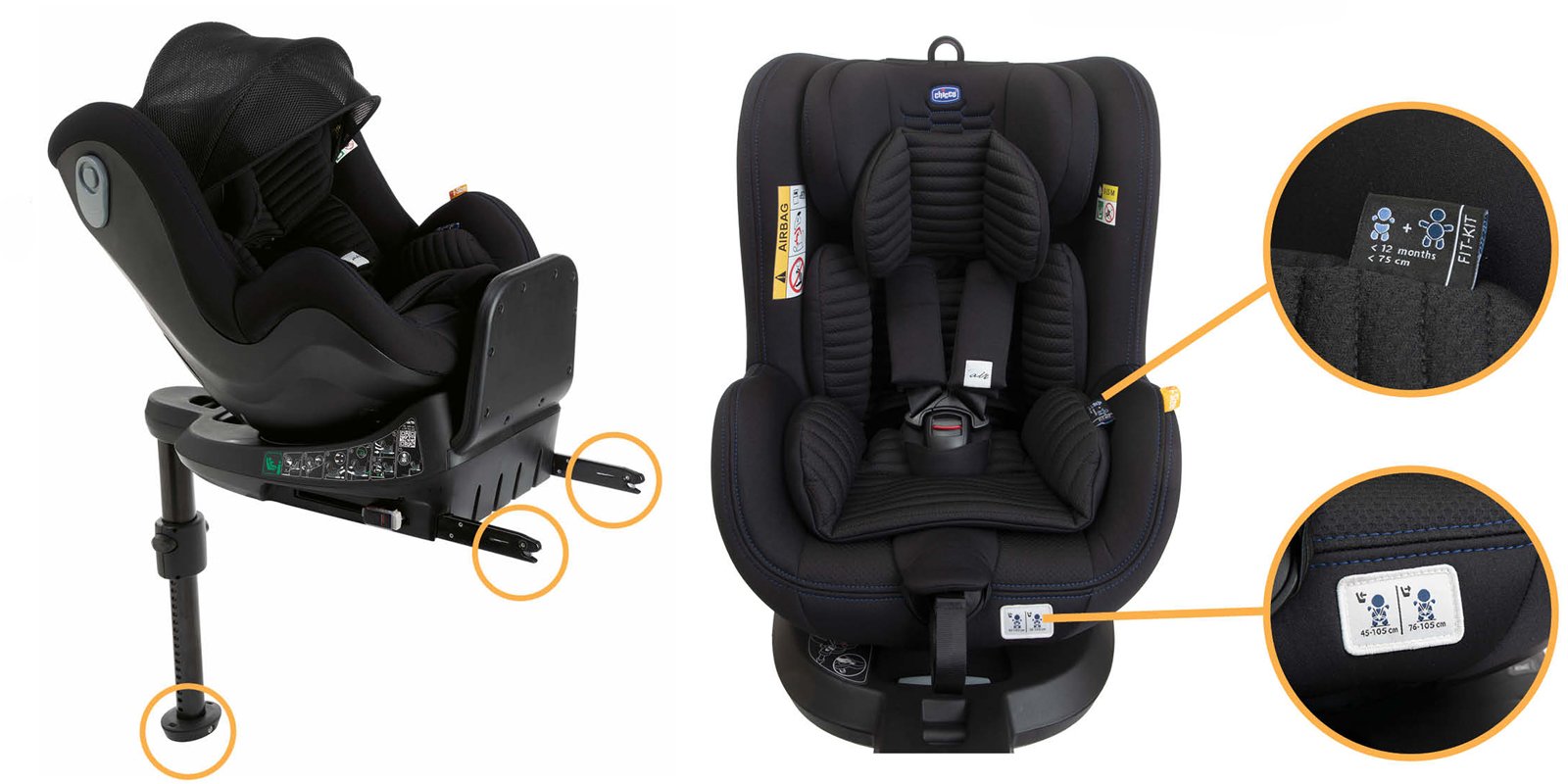 • Fit-Kit – система ярликів-підказок допомагає зрозуміти віковий діапазон використання, підказує як правильно встановити автокрісло та використовувати систему ременів безпеки.