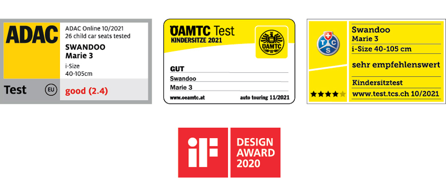 Автокрісло Marie 3 отримало титул «Найкраще у категорії» (схвалено приблизно до 4 років/40-105 см) в рамках споживчих випробувань ADAC, ÖAMTC і TCS восени 2021 року, а також дивовижний рейтинг безпеки в п’ять зірок у положенні обличчям проти руху.
