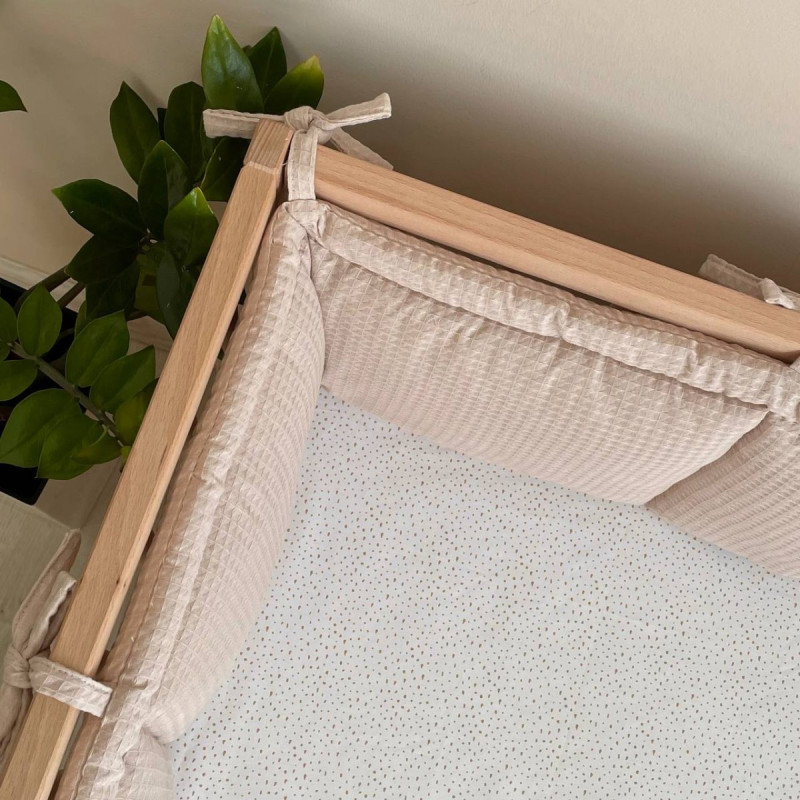 Фенс-бортики - новий різновид цілісних бортиків на три сторони ліжечка. За допомогою зав'язок вони кріпляться на стінки ліжечка, створюючі затишне "гніздечко" для сну немовляти.