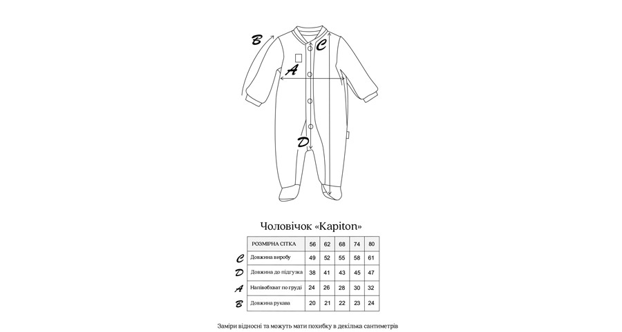Цей чоловічок в собі усе це і поєднує. Чоловічок має застібку у дві ніжки, означає зручно. Виконаний з тканини "Капітоне" - два шари трикотажу простьобаного тоненьким шаром синтепона, означає теплий. І оскільки трикотаж бавовняний з лиця та вивороту, означає натуральний. Красивим його робить текстура тканини, шкіряна обробка і ґудзики. На рукавцях у розмірі 62, 68 вбудовані царапки.