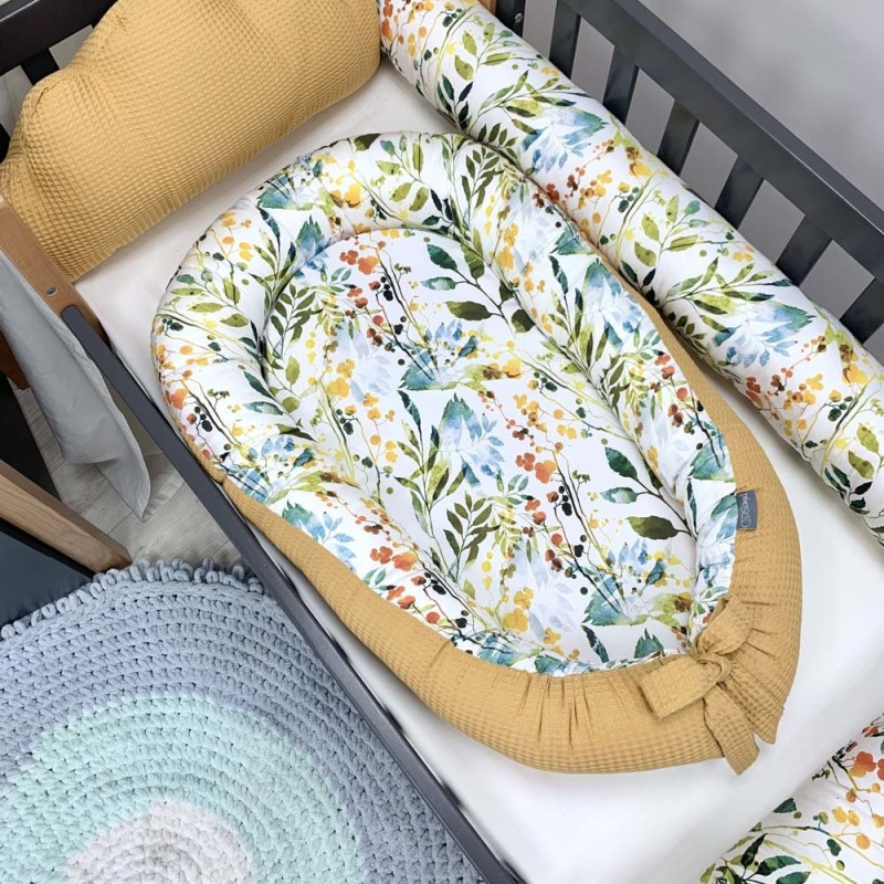 Гніздечко-кокон-це невеликий, ергономічний, плоский матрац з м'якими обмежувальними бортиками по всьому периметру заввишки 10 см. Наповнювач матраца - піна, пружний, сучасний, модифікований матеріал, який рівномірно розподіляє навантаження, завдяки чому малюк почуває себе затишно і комфортно. Чохол матраца пошитий з мікрофібри. Наповнювач для бортиків - силіконізоване волокно. Бортики можна стягнути спеціальною ниткою, яка вже вшита в кокон і зафіксувати бантом, таким чином можна зменшувати, або збільшувати розмір кокона-гніздечка. Тканина чохла - натуральна 100% бавовна поплін.