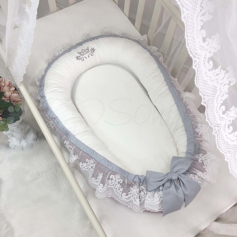 Гніздечко-кокон-це невеликий, ергономічний, плоский матрац з м'якими обмежувальними бортиками по всьому периметру заввишки 15 см. Наповнювач матраца - піна, пружний, сучасний, модифікований матеріал, який рівномірно розподіляє навантаження, завдяки чому малюк почуває себе затишно і комфортно. Чохол матраца пошитий з мікрофібри. Наповнювач для бортиків - силіконізоване волокно. Бортики можна стягнути спеціальною ниткою, яка вже вшита в кокон і зафіксувати бантом, таким чином можна зменшувати, або збільшувати розмір кокона-гніздечка. Тканина чохла - сатин.