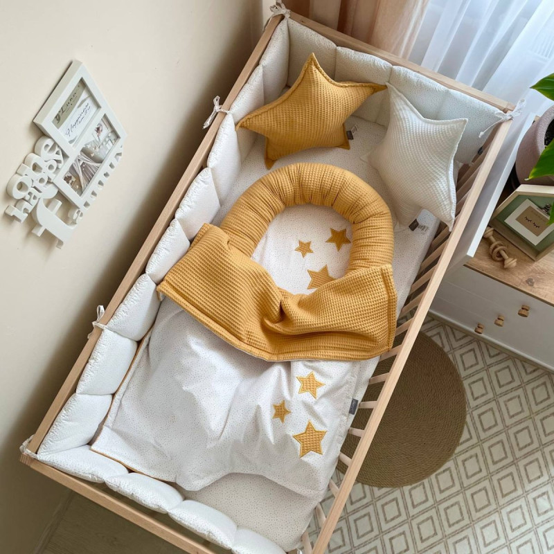 Кокон Stars - це невеликий, ергономічний, плоский матрац з м'якими обмежувальними бортиками із вафельної тканини по всьому периметру заввишки 10 см. Матрацик кокона прикрашає вишивка у вигляді трьох зірочок. Наповнювач матраца - піна, пружний, сучасний, модифікований матеріал, який рівномірно розподіляє навантаження, завдяки чому малюк почуває себе затишно і комфортно. Чохол матраца пошитий з мікрофібри. Наповнювач для бортиків - силіконізоване волокно. Бортики фіксуються за допомогою кнопок. Тканина чохла - натуральна 100% бавовна - вафельна тканина.