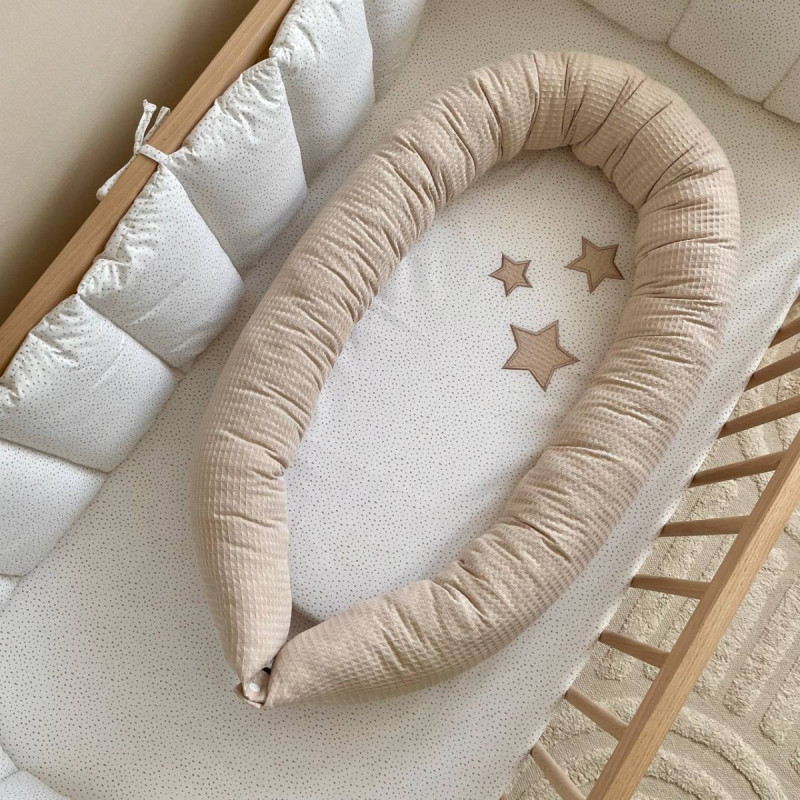 Кокон Stars - це невеликий, ергономічний, плоский матрац з м'якими обмежувальними бортиками із вафельної тканини по всьому периметру заввишки 10 см. Матрацик кокона прикрашає вишивка у вигляді трьох зірочок. Наповнювач матраца - піна, пружний, сучасний, модифікований матеріал, який рівномірно розподіляє навантаження, завдяки чому малюк почуває себе затишно і комфортно. Чохол матраца пошитий з мікрофібри. Наповнювач для бортиків - силіконізоване волокно. Бортики фіксуються за допомогою кнопок. Тканина чохла - натуральна 100% бавовна - вафельна тканина.