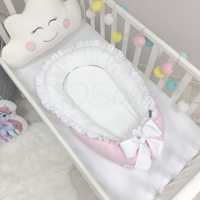 Гніздечко-кокон-це невеликий, ергономічний, плоский матрац з м'якими обмежувальними бортиками по всьому периметру заввишки 10 см. Наповнювач матраца - піна, пружний, сучасний, модифікований матеріал, який рівномірно розподіляє навантаження, завдяки чому малюк почуває себе затишно і комфортно. Чохол матраца пошитий з мікрофібри. Наповнювач для бортиків - силіконізоване волокно. Бортики можна стягнути спеціальною ниткою, яка вже вшита в кокон і зафіксувати бантом, таким чином можна зменшувати, або збільшувати розмір кокона-гніздечка. Тканина чохла - натуральна 100% бавовна поплін.