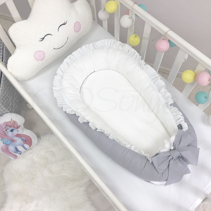 Гніздечко-кокон-це невеликий, ергономічний, плоский матрац з м'якими обмежувальними бортиками по всьому периметру заввишки 10 см. Наповнювач матраца - піна, пружний, сучасний, модифікований матеріал, який рівномірно розподіляє навантаження, завдяки чому малюк почуває себе затишно і комфортно. Чохол матраца пошитий з мікрофібри. Наповнювач для бортиків - силіконізоване волокно. Бортики можна стягнути спеціальною ниткою, яка вже вшита в кокон і зафіксувати бантом, таким чином можна зменшувати, або збільшувати розмір кокона-гніздечка. Тканина чохла - натуральна 100% бавовна поплін.
