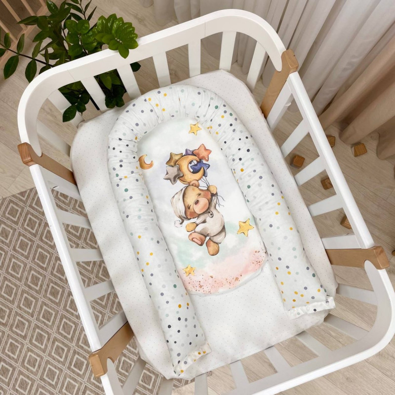 Гніздечко-кокон-це невеликий, ергономічний, плоский матрац з м'якими обмежувальними бортиками по всьому периметру заввишки 10 см. Наповнювач матраца - піна, пружний, сучасний, модифікований матеріал, який рівномірно розподіляє навантаження, завдяки чому малюк почуває себе затишно і комфортно. Чохол матраца пошитий з мікрофібри. Бортики можна стягнути спеціальною ниткою, яка вже вшита в кокон і зафіксувати бантом, таким чином можна зменшувати, або збільшувати розмір кокона-гніздечка.