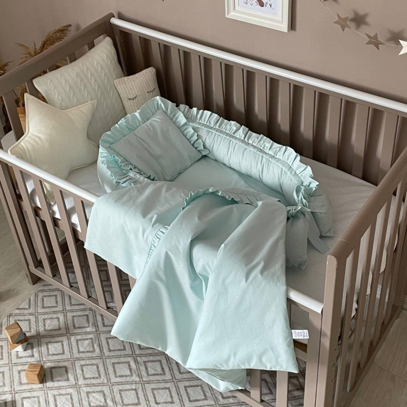 Гніздечко-кокон-це невеликий, ергономічний, плоский матрац з м'якими обмежувальними бортиками по всьому периметру заввишки 15 см. Наповнювач матраца - піна, пружний, сучасний, модифікований матеріал, який рівномірно розподіляє навантаження, завдяки чому малюк почуває себе затишно і комфортно. Чохол матраца пошитий з мікрофібри. Наповнювач для бортиків - силіконізоване волокно. Бортики можна стягнути спеціальною ниткою, яка вже вшита в кокон і зафіксувати бантом, таким чином можна зменшувати, або збільшувати розмір кокона-гніздечка. Тканина чохла - натуральна 100% бавовна поплін.