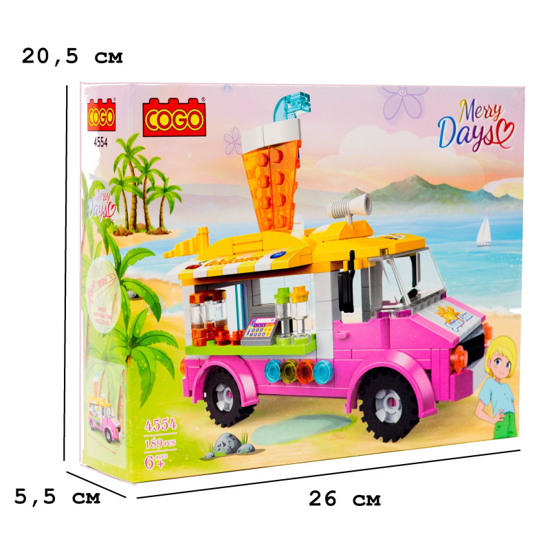 Що може бути краще в літню спеку, ніж насолодитися прохолодним морозивом. З конструктором Cogo Girls Пляжний фургон, арт. 4554, насолодитися освіжаючими ласощами можна просто на пляжі. Морозиво або заморожений сік, а можливо, прохолодний коктейль - вибирайте тільки вам. Щоб почати грати, потрібно лише присвятити трохи часу збірці та проявити фантазію. Набір складається зі 189 пластикових елементів. Деталі виконані з якісних і безпечних матеріалів, добре скріплюються між собою, а готова конструкція міцна і не зруйнується навіть у процесі найактивніших ігор. У комплект входить пластикова фігурка.У процесі гри діти зможуть комбінувати різні деталі та вигадувати свої сюжети. Яскраві елементи привертають дитячу увагу і сприяють цікавому проведенню часу. Такі ігри сприяють розвитку дрібної моторики, логіки, фантазії та просторового сприйняття. Деталі конструктора - універсальні та сумісні з іншими аналогічними конструкторами світових виробників. У комплекті: 189 деталей, інструкція. Розміри фургона: 16,5*7,8*12 см. Рекомендується для дітей від 6 років. Розміри упаковки: 26*5,5*20,5 см.