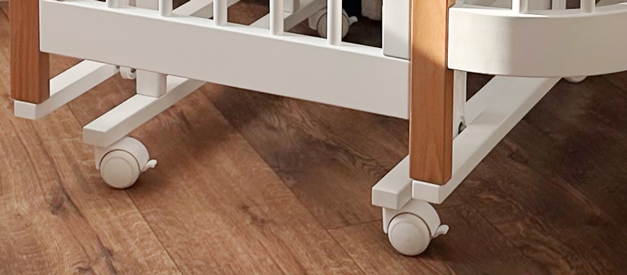 - Колеса для мобільності. Ліжечко Minimi 5 в 1 можна доповнити колесами (до комплекту не входять), які дозволяють переміщати його між кімнатами, щоби малюк завжди був під вашим наглядом. Завдяки компактним розмірам воно проходить у дверні отвори шириною від 80 см.