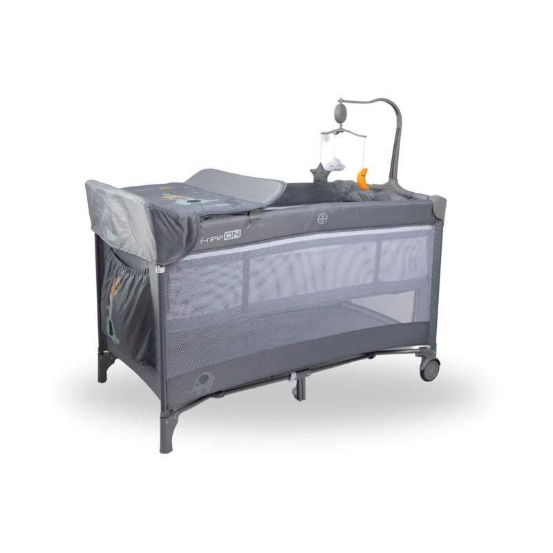Ліжко-манеж дитяче FreeON з другим ярусом Elephants grey. Нове портативне ліжечко з подвійним дном FreeON Elephants — ідеальне рішення для безтурботних подорожей, де вашій малечі буде комфортно спати, а ви зможете легко доглядати за дитиною на пеленальному килимку, що входить у комплект. Переносне ліжечко FreeON Elephants дозволяє встановити дві різні висоти матраца, адаптуючи використання ліжка до віку вашої дитини. Верхня висота матраца підходить для дітей від 0 до 9 кілограмів або поки дитина не почне сідати або вставати. До ліжечка також додається мобіль, який ніжно заколисує вашу дитину спати. Завдяки килимку для сповивання, який входить у комплект, ви можете комфортно доглядати за своєю дитиною, де б ви не були. Ви можете використовувати пеленальний килимок, поки ваша дитина не досягне 11 кг. Щоб усе необхідне для догляду за дитиною було під рукою, ми додали до ліжечка зручну кишеню.