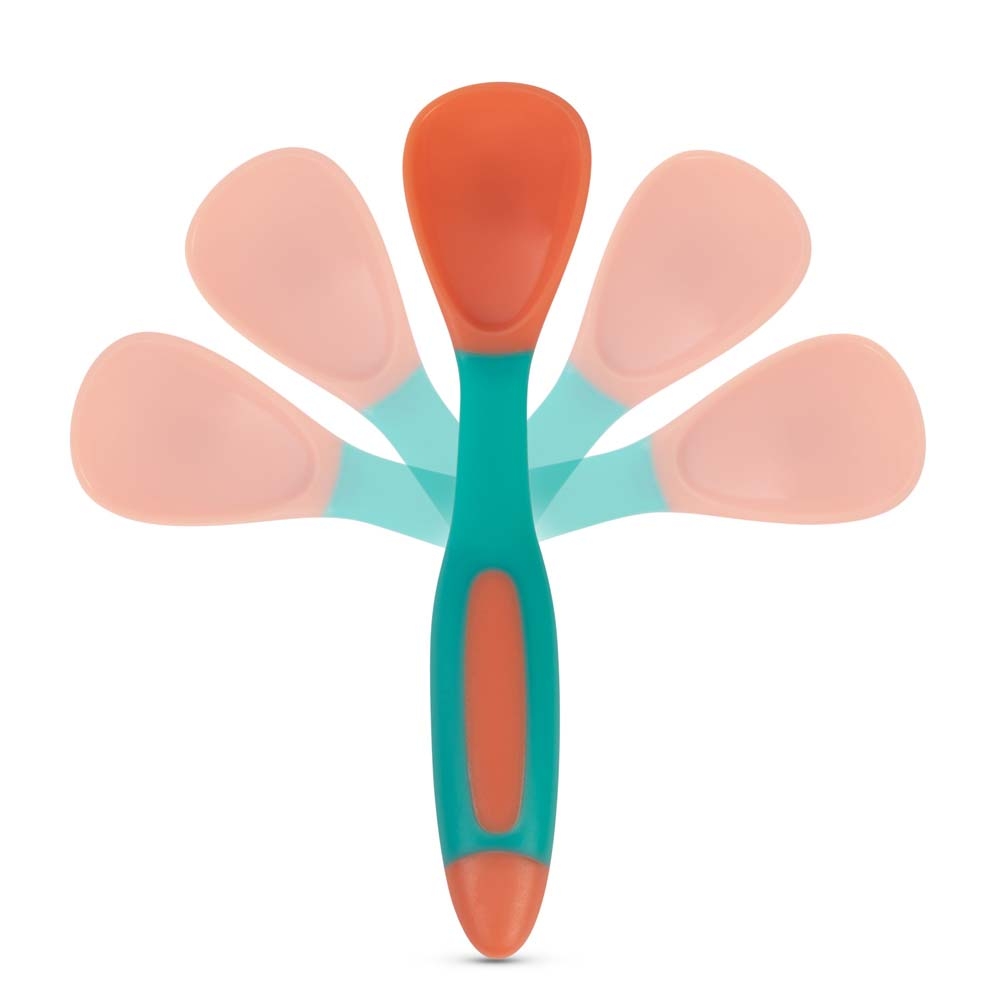 Ручки приладів можуть згинатися під будь-яким кутом і відмінно тримають задану форму, що допоможе дитині легко донести їжу в рот. Спеціальне антиковзне покриття забезпечує зручне захоплення маленькими долоньками дитини.