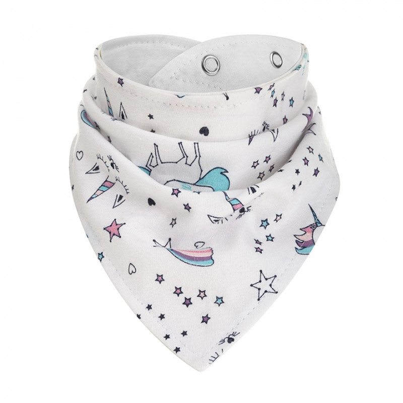 Дитяча бандана, двошарова, яка завдяки своїй формі та способу виконання виконує 2 функції: не тільки захищає одяг вашого малюка від псування під час їжі, а також від пускання слинів або плювків, а й може використовуватися як стильний предмет одягу, що захищає шию дитини. Вони мають регульовані застібки-кнопки, які можна вкоротити чи подовжити, тому вони ростуть разом із дитиною. Виріб виготовлений з м'якої 100% бавовни і ідеально підійде для чутливої шкіри немовлят.