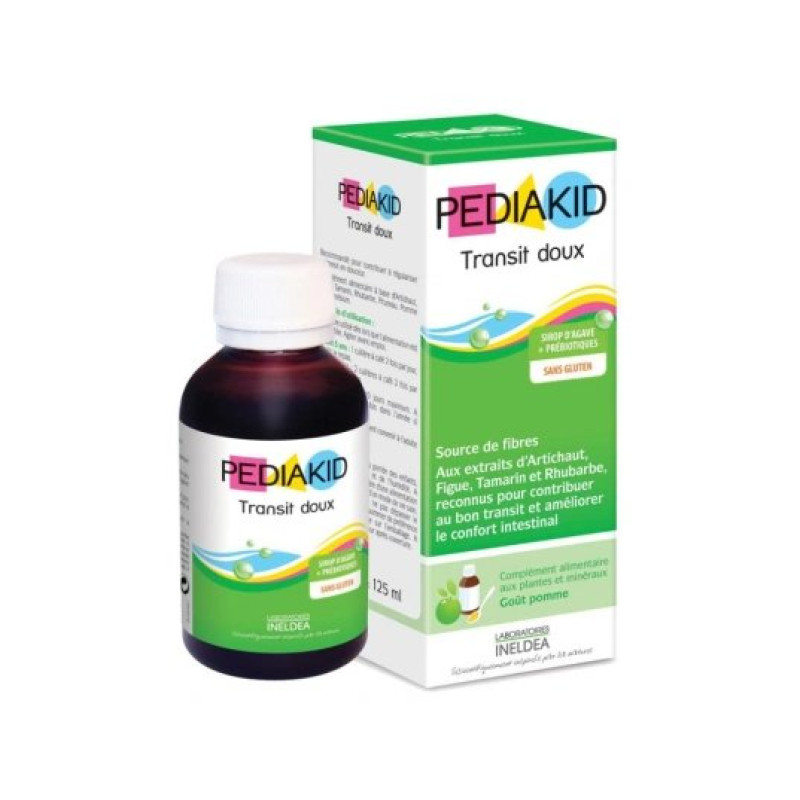 PEDIAKID TRANSIT DOUX - натуральний питний засіб для дітей на основі нектару агави, пребіотиків та екстрактів плодів інжиру, плодів сливи, листа артишоку, плодів тамаринду, кореня ревеню; з магнієм. Смак: яблуко.