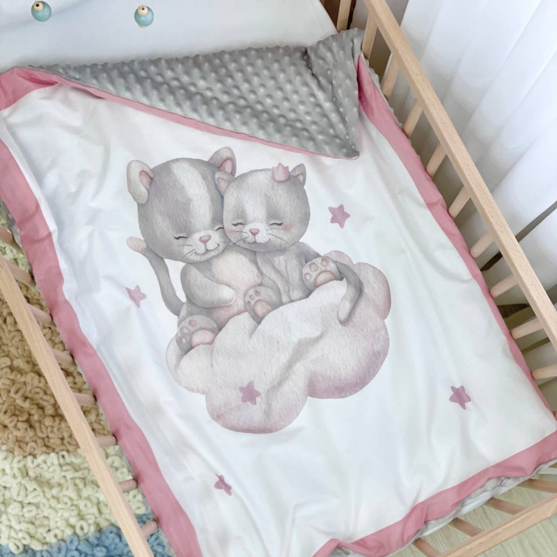 для щоденного використання двосторонній плед-конверт на блискавці з ковдрою, яка виймається при необхідності, бантик входить в комплектацію. Виріб складається з двох частин: плед на блискавці, з одного боку виготовленого з попліну, з іншого – з плюшу Minky, всередені ковдра, пошита з мікрофібри, наповнювач - штучний лебединий пух. На дотик це рельєфний, м'який і досить теплий і щільний виріб.