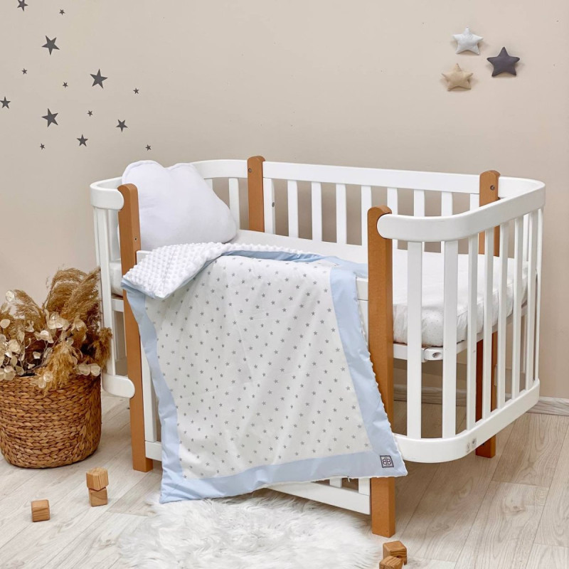 для щоденного використання двосторонній плед-конверт на блискавці з ковдрою, яка виймається при необхідності, бантик входить в комплектацію. Виріб складається з двох частин: плед на блискавці, з одного боку виготовленого з попліну, з іншого – з плюшу Minky, всередені ковдра, пошита з мікрофібри, наповнювач - штучний лебединий пух. На дотик це рельєфний, м'який і досить теплий і щільний виріб.