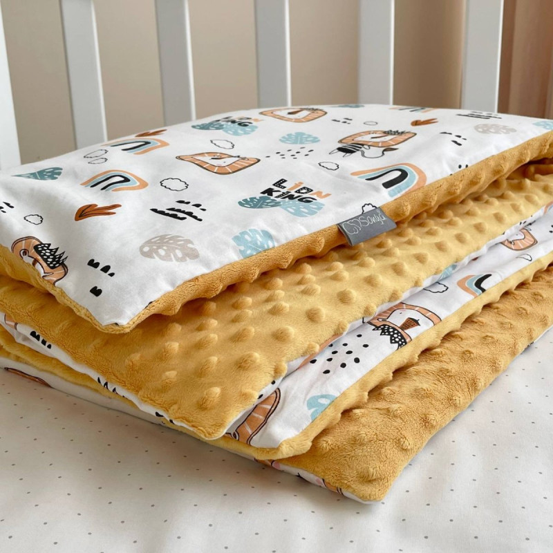 для щоденного використання двосторонній плед-конверт з ковдрою всередені, яка виймається при необхідності. Виріб складається з двох частин: плед на блискавці, з одного боку виготовленого з попліну, з іншого – з плюшу Minky, та ковдри з мікрофібри, наповнювач ковдри - штучний лебединий пух. На дотик-це рельєфний, м'який і досить теплий і щільний виріб.
