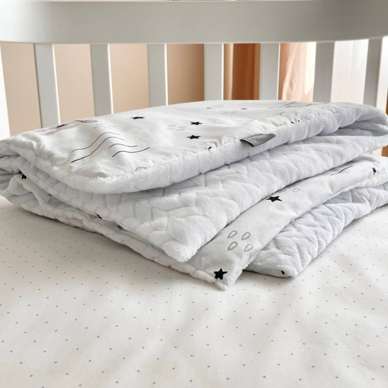 для щоденного використання двосторонній плед-конверт з ковдрою всередені, яка виймається при необхідності. Виріб складається з двох частин: плед на блискавці, з одного боку виготовленого з попліну, з іншого – з плюшу Minky, та ковдри з мікрофібри, наповнювач ковдри - штучний лебединий пух. На дотик-це рельєфний, м'який і досить теплий і щільний виріб.
