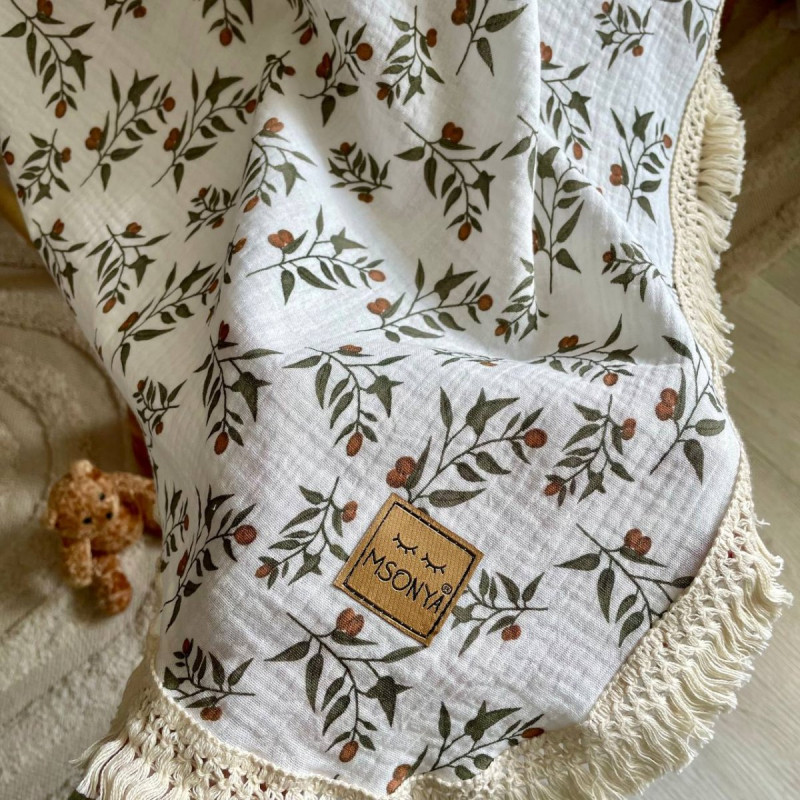 Плед Msonya муслін жатка двошаровий з бахромою Гілочка оливи на молочному