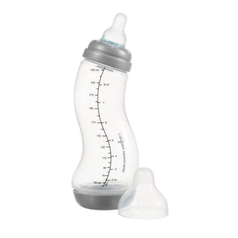 | Пляшечка має S-подібну форму, яка дозволяє молоку текти без повітря.