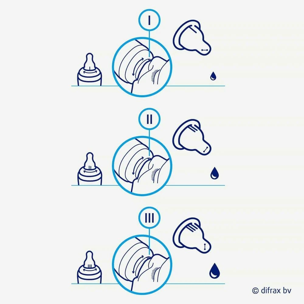 Щоб налаштувати потік, злегка послабте кільце на пляшечці, поверніть соску так, щоб потрібне положення (I для рідкої їжі, II для злегка густої, III для густої їжі) опинилося під носиком. Потім знову закріпіть кільце і продовжуйте годування.