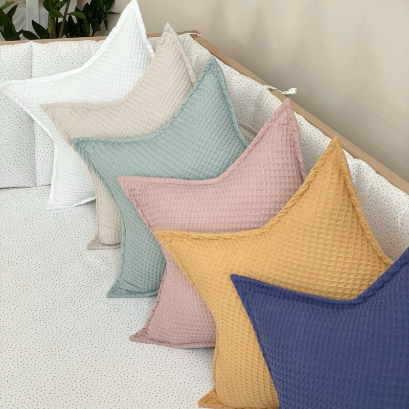 Красива і оригінальна подушечка у формі зірки для дитячого ліжечка. Завдяки подушечці, у ліжечку створюється затишна атмосфера, а також, декор використовують для фотосесій.