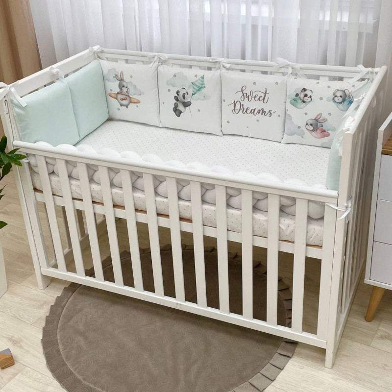 В комплект входить:Захист з подушечок на блискавці: 8 штук 30 х 32 см., 1 штука бортик-Бортик-коса 120 х 17 +/- 3 см. Простирадло на гумці, 120 Х 60 Х 15 см.