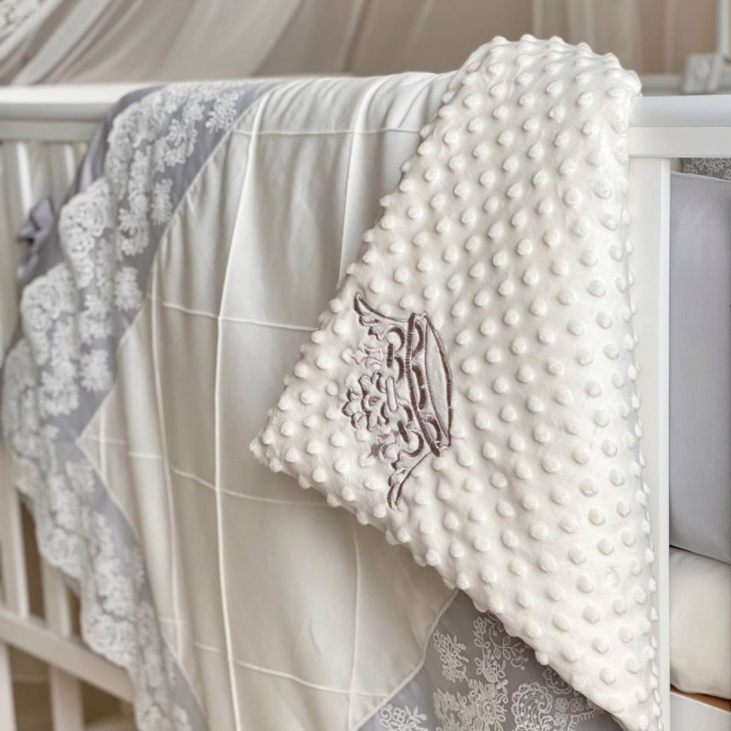 Комплект постільної білизни з 4 предметів (бортики, плед-конверт з ковдрою(сатин/Minky/вишивка/мереживо), бантик, простирадло).