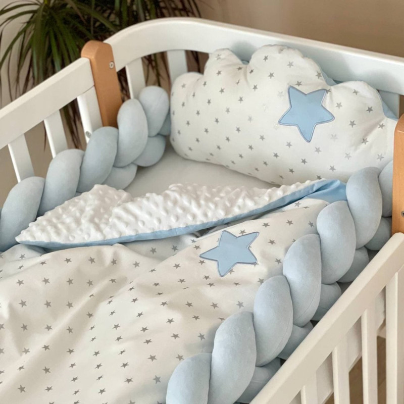 Комплектація:захист на 4 сторони ліжечка з окремих частин; ; бортик-коса (матеріал велюр, наповнювач холлофайбер)120 х 17 +/- 2 см - 2 шт. ; подушка хмаринка 30 х 55 +/- 2см. - 2 шт. ; плед-конверт з ковдрою, 80 х 100 +/- 2 см. ; бантик на резинці ;простирадло на резинці, 120 х 60 х 15 +/- 2 см. ; комплект запакований в прозорий чемодан з ручками.