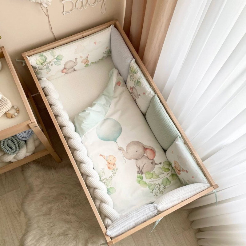 Комплект пошитий з натурального бавовняного матеріалу - попліна та вафельний тканини. Простирадло на гумці ідеально повторює форму матраца в ліжку.Наповнювач бортиків - силіконізоване волокно, наповнювач подушки, ковдри - штучний лебединий пух.