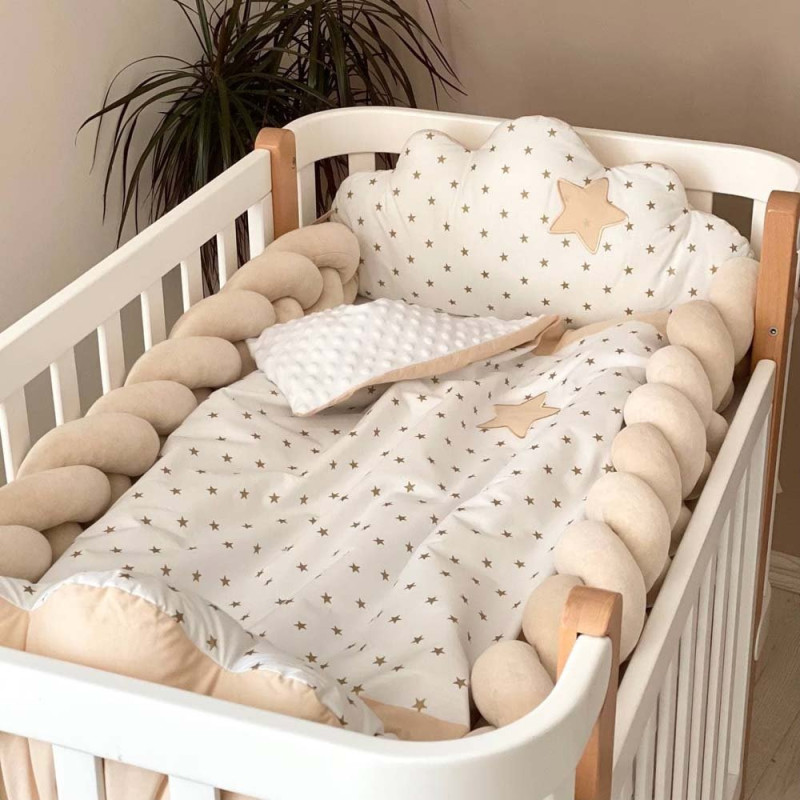 Комплект постільної білизни із 4 предметів (бортики, плед-конверт з ковдрою, простирадло), 100% бавовна.