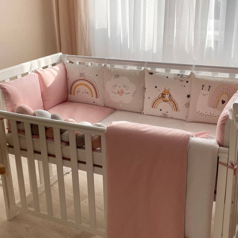 Комплект постільної білизни з 6 предметів (бортики, ковдра, подушка, підковдра, наволочка, простирадло), 100% бавовна.