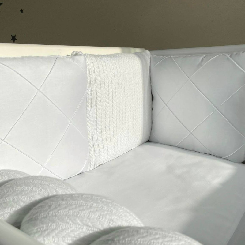 Комплектація:підковдра 90х110+-2 см ;ковдра 90*110+-2 см ; подушка 40х60+-2 см ;наволочка 40х60+-2см ; простирадло 60*120см на резинці ;комплект запакований в прозорий чемодан з ручками.; бортики - 8 обємних подушечок (із сатину 30 х 30 +/- 2см - 4шт, з тканини "косичка" 30 х 30 +/- 2см - 4шт, бортик-косичка- 120 см+/- 2см - 1шт)