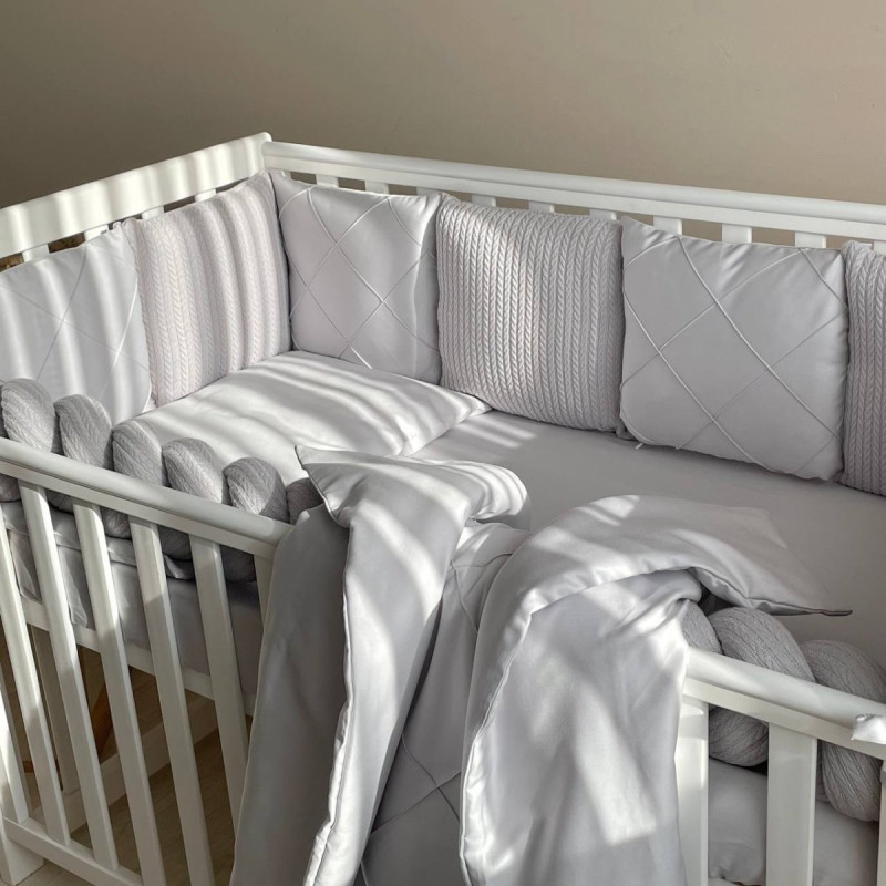 Комплектація:підковдра 90х110+-2 см ;ковдра 90*110+-2 см ; подушка 40х60+-2 см ;наволочка 40х60+-2см ; простирадло 60*120см на резинці ;комплект запакований в прозорий чемодан з ручками.; бортики - 8 обємних подушечок (із сатину 30 х 30 +/- 2см - 4шт, з тканини "косичка" 30 х 30 +/- 2см - 4шт, бортик-косичка- 120 см+/- 2см - 1шт)