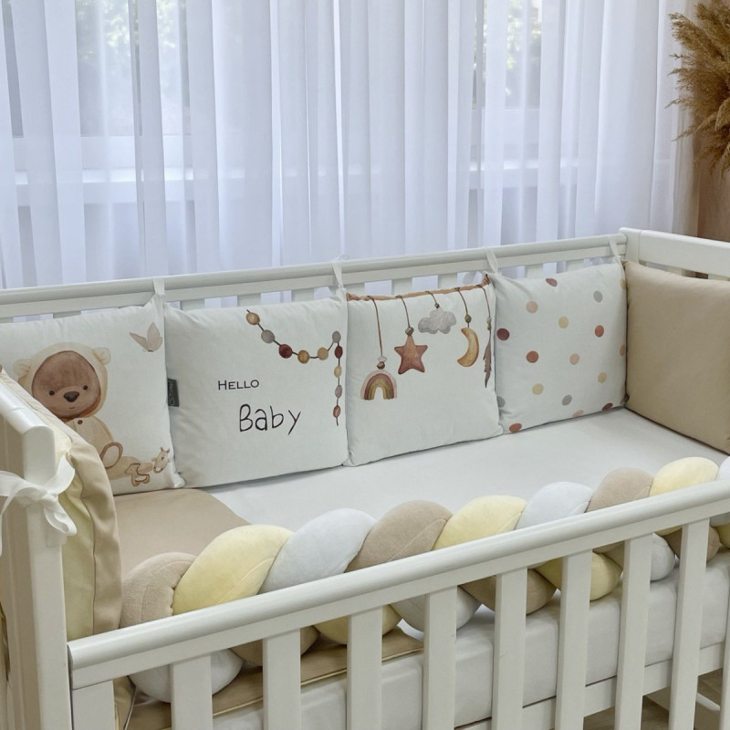 Комплект постільної білизни з 6 предметів (бортики, ковдра, подушка, підковдра, наволочка, простирадло), 100% бавовна.