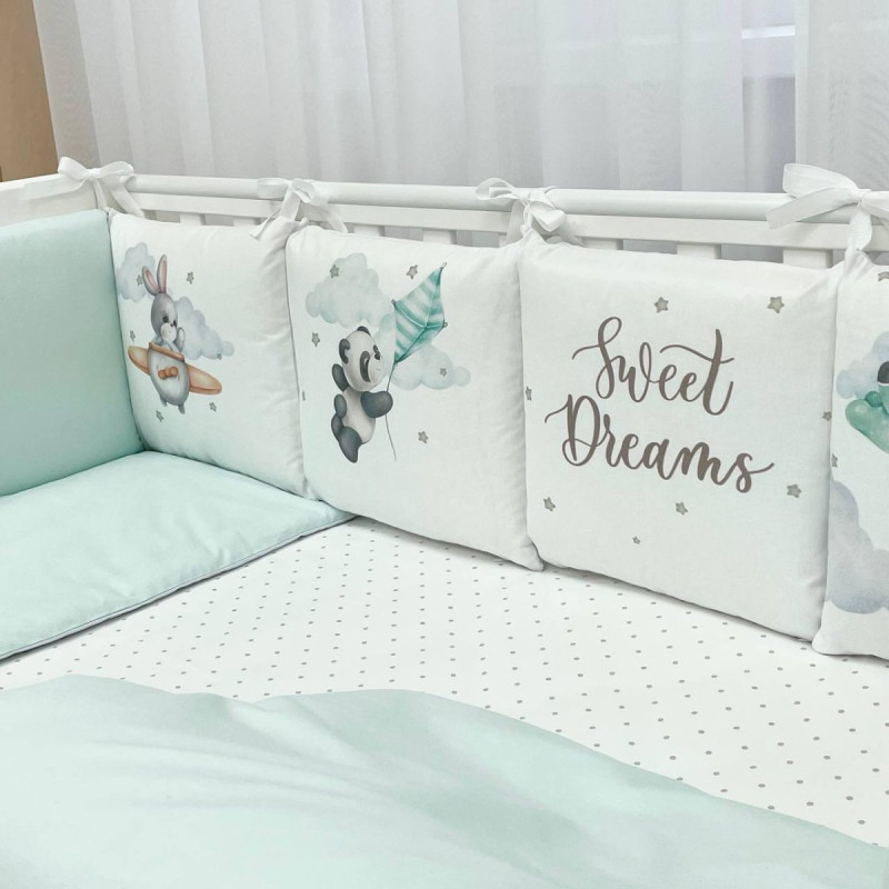 Комплект постільної білизни з 6 предметів (бортики, ковдра, подушка, підковдра, наволочка, простирадло), 100% бавовна.