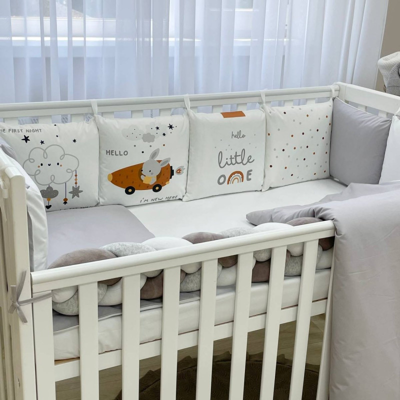 Комплект постільної білизни з 6 предметів (бортики, ковдра, подушка, підковдра, наволочка, простирадло), 100% бавовна.