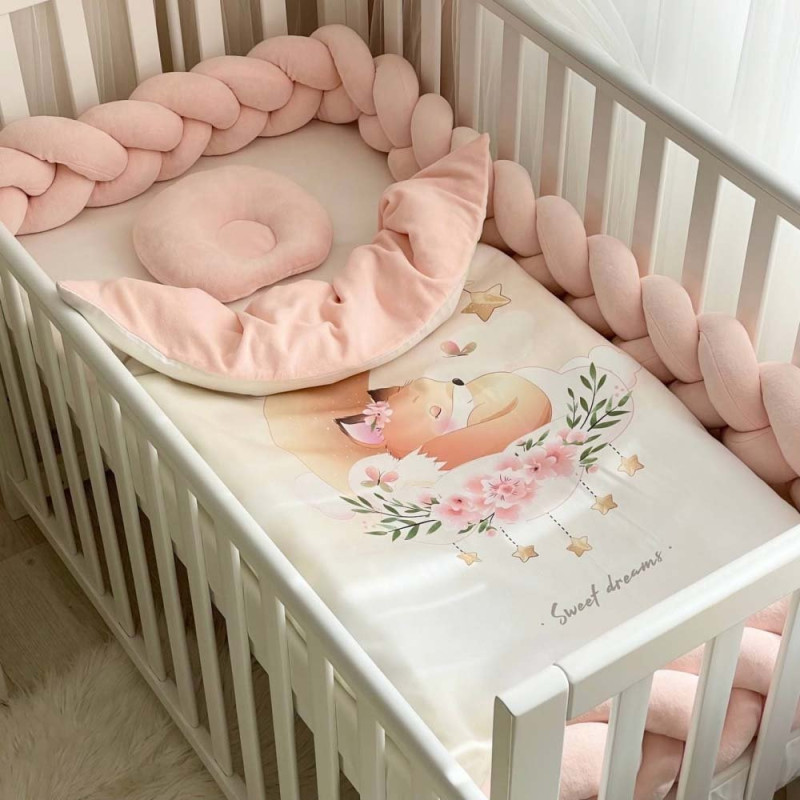 Комплект постільної білизни з 5 предметів (бортик-коса, анатомічна подушка, плед-конверт з ковдрою, бантик, простирадло), 100% бавовна.