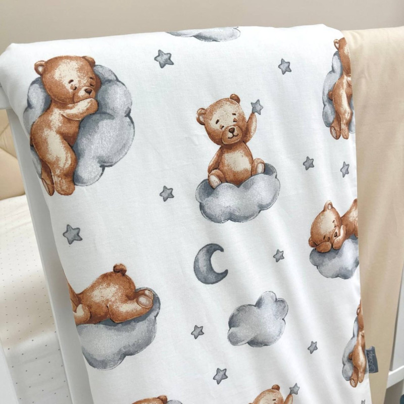 Підковдра, наволочка та простирадло, пошиті з натурального бавовняного матеріалу попліна. Простирадло на гумці ідеально повторює форму матраца в ліжку. Ecotton – екологічно чистий, гіпоалергенний наповнювач, створений на основі натуральних бавовняних волокон. Ecotton полегшений та вдосконалений спеціально для виготовлення ковдр та подушок у ліжечко, на базі основних норм та вимог до постільних речей для найменших. Наповнювач бортиків - силіконізоване волокно.