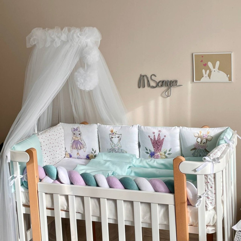 Комплектація:захист із роздільних частин- обємних подушечок на блискавці 8 штук 30 х 32 +/- 2 см.; бортик-коса (матеріал велюр, наповнювач холлофайбер) 120 х 17 +/- 2 см.;ковдра, 110 х 90 +/- 2 см.; підковдра на блискавці, 110 х 90 +/- 2 см.; подушечка, 40 х 60 +/- 2 см.; наволочка, 40 х 60 +/- 2 см.; простирадло на резинці, 120 х 60 х 15 +/- 2 см.; комплект запакований у прозорий чемодан з ручками.