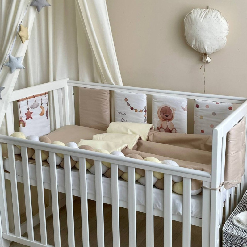Комплект постільної білизни з 6 предметів (бортики, ковдра, подушка, підковдра, наволочка, простирадло), 100% бавовна.