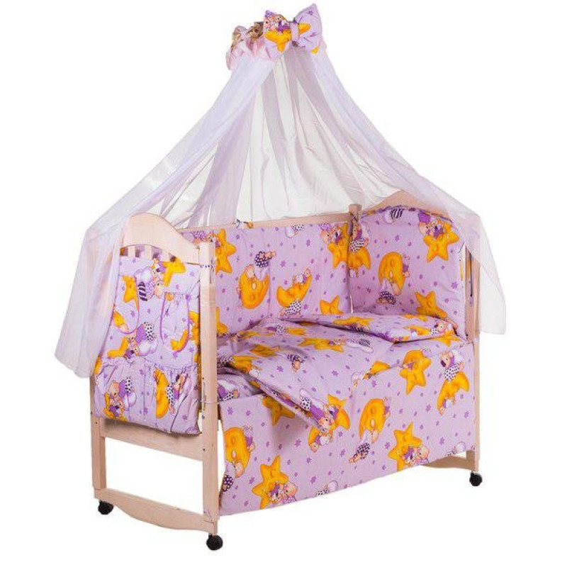 Комплектація:бортики;балдахін;подушка;ковдра;наволочка;підковдра;простирадло;