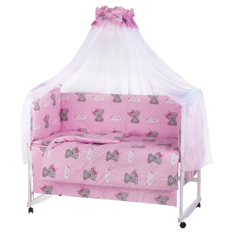 Комплектація:бортики;балдахін;подушка;ковдра;наволочка;підковдра;простирадло;