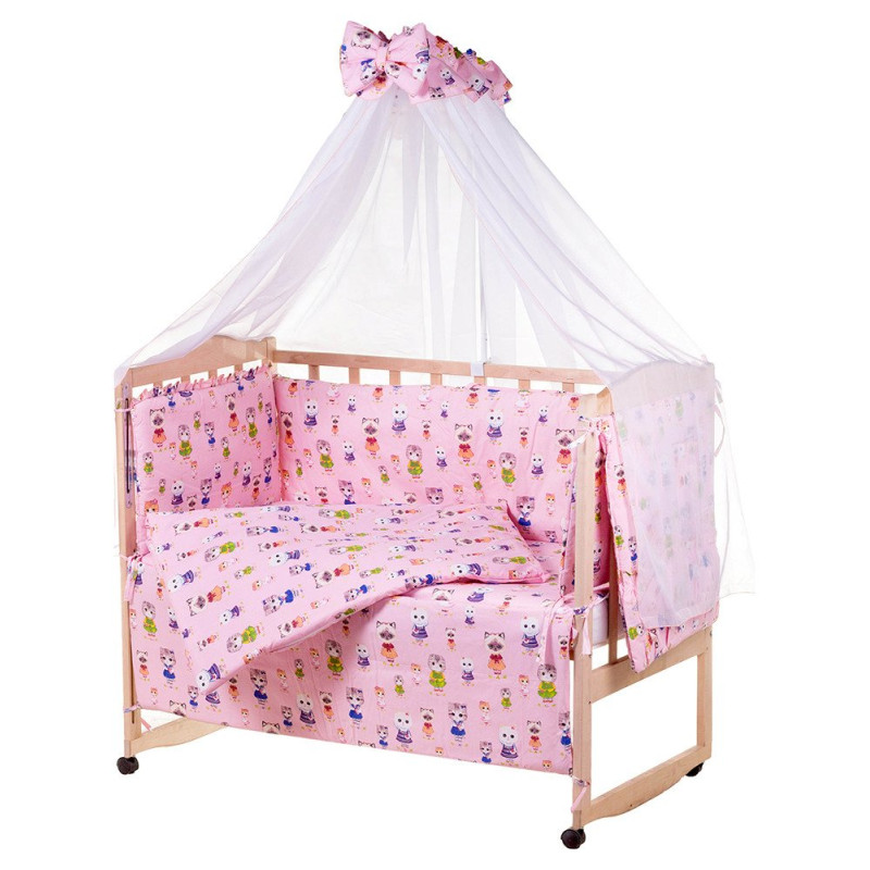 Комплектація:бортики;балдахін;подушка;ковдра;наволочка;підковдра;простирадло;