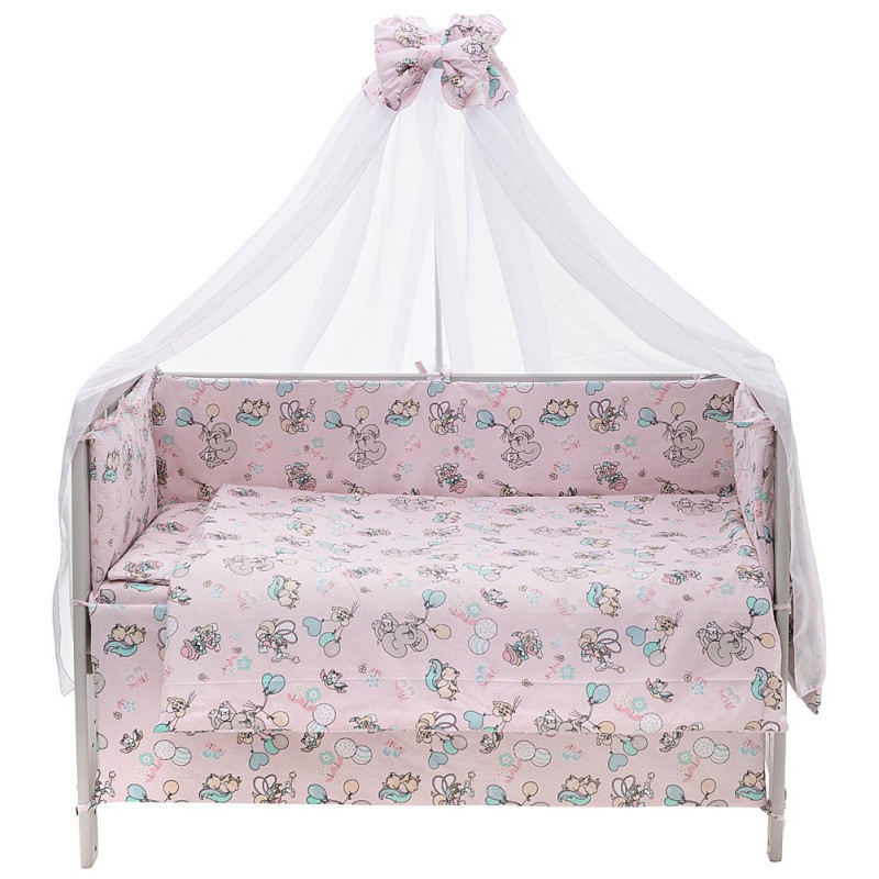 Комплектація:бортики;балдахін;подушка;ковдра;наволочка;підковдра;простирадло;