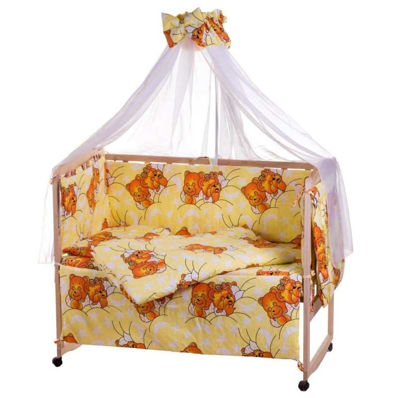 Комплектація:бортики;балдахін;подушка;ковдра;наволочка;підковдра;простирадло;
