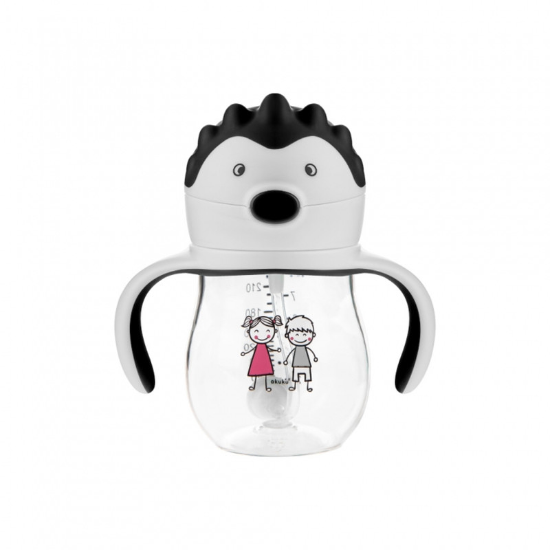 Чашка з обтяженою соломинкою дозволяє пити під будь-яким кутом — малюк може пити, тримаючи чашку навіть догори дном. Вона виготовлена з інноваційного матеріалу TRITAN, який абсолютно не містить BPS, стійкий до подряпин та зміни кольору, але при цьому виглядає як скло. Завдяки спеціальній конструкції рідина випивається до останньої краплі. Переваги: щільна кришка запобігає виливанню напоїв і захищає соломинку від бруду; зручне відкривання натисканням кнопки; прозорість та мірна шкала для контролю кількості рідини. Чашку можна мити в посудомийній машині (за винятком соломинки з тягарцем). Об'єм: 250 мл.