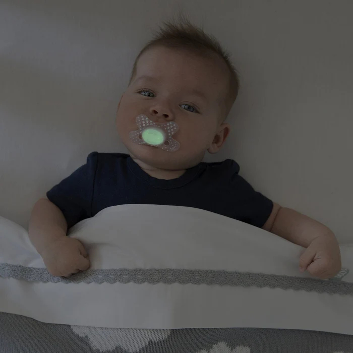 Особливістю цієї пустушки є ручка, яка поглинає світло і світиться в темряві, що допомагає знайти її навіть вночі. Виїмка для носика та два отвори для повітря забезпечують оптимальний потік повітря, запобігаючи подразненню шкіри малюка. Розроблена в співпраці з педіатрами, ця пустушка підтримує розвиток м'язів щелепи та язика, стимулюючи правильний розвиток.