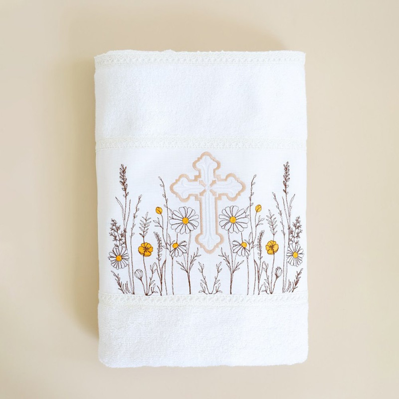 Оздоблена ніжною вишивкою у вигляді хреста з українським візерунком, як і в наборах для хрещення.