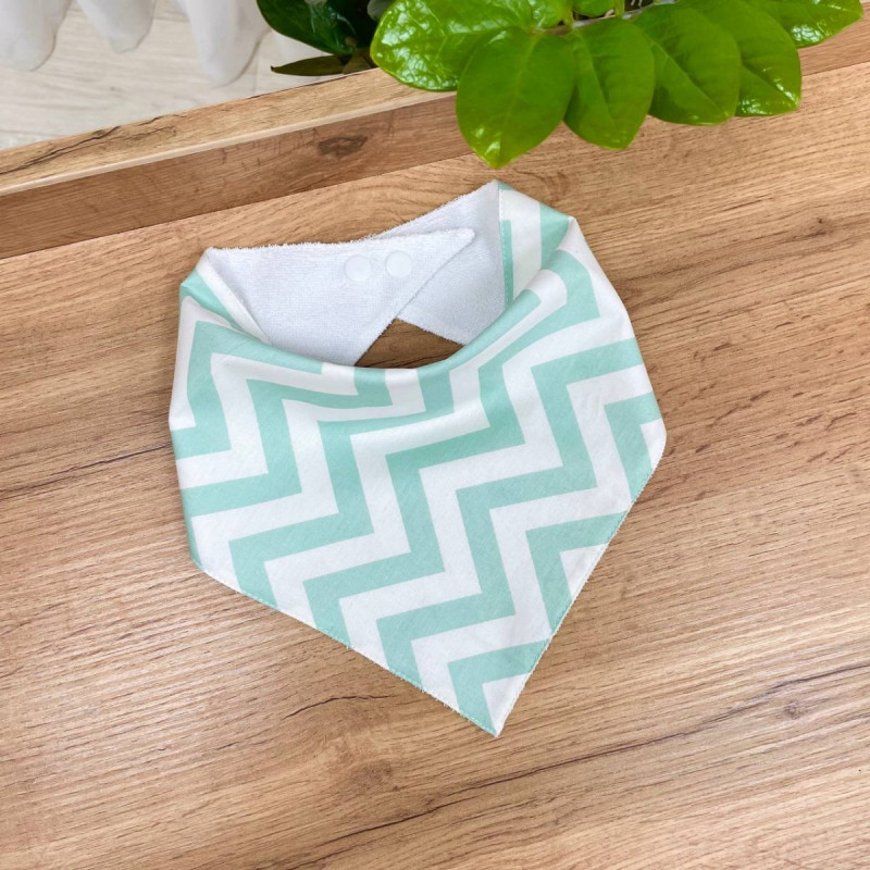 Слинявчик-куточок на кнопці являє собою трикутник розміром 46х23х23, двошаровий склад, 100% бавовна. Одна сторона виконана з попліну, а інша з м'якої махри. Між ними знаходиться спеціальний мембранний шар, який повністю водонепроникний.